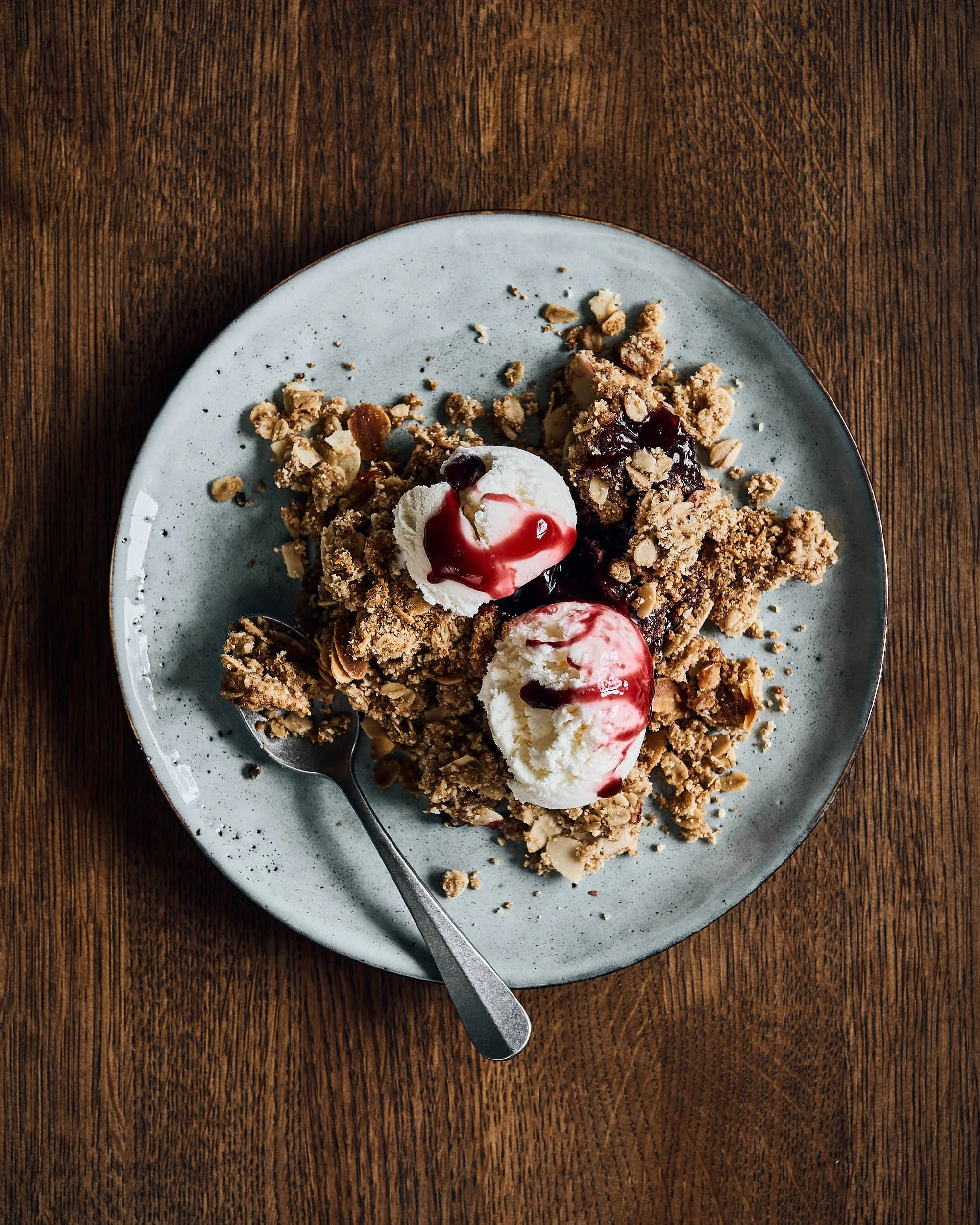 Krõbediku kate tuli käsitsi kokku näppida. See on teraapiline meetod. Mandlilaastud, -jahu, kaerahelbed, pruun suhkur ja külm või. Mõtlesin natuke kaneeli ka panna, aga tahtsin, et see maitseks nagu dekadents, mitte nagu jõulud.
